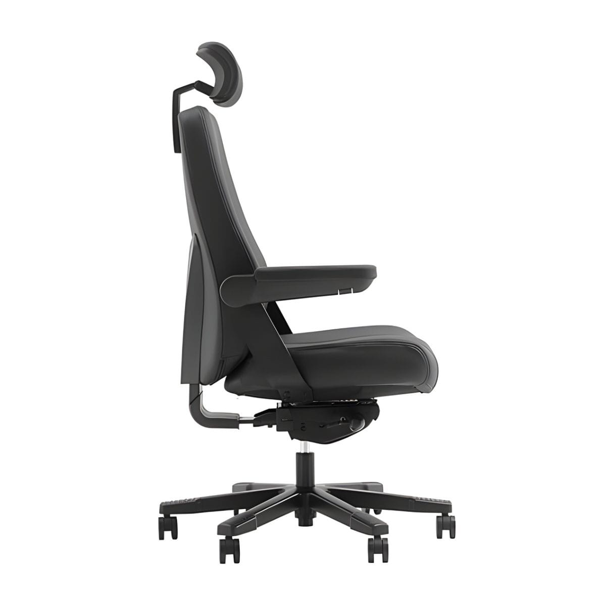 Features include headrest, adjustable arms, adjustable lumbar support, seat slider and upholstered in black leather.